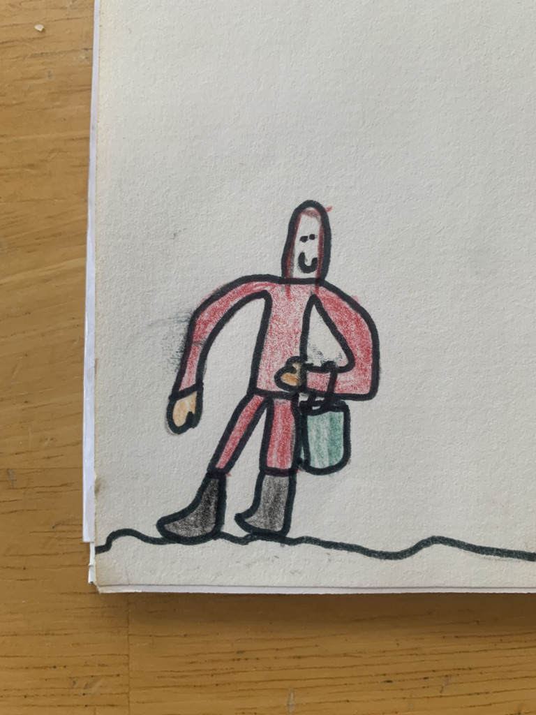 While it has historically been considered Mr. Hughes’s’ second and very likely final work of fiction for children as both typist and crayolist by the author’s own admission in a now-unavailable audio interview (allegedly due to a melted cassette tape), the recent resurfacing of yet another very short, yarn-bound, copy paper on construction paper (noticeably lacking the more refined black marker outlined figures and smoother work of glue stick backing of The Strangest Snowy Day [bearing the quizzical and never-verified imprint of Silver Diamond Pub. Co. along the spine]), The Little Centipede, redraws our old assumptions attached to The Strangest Snowy Day. Together with the betwixtly composed and frightening work of The Grizzly Bear, with its infamous ‘DO THEY GET HURT???’ teaser inside the front cover (not pictured), the pieces were apparently produced on an annual basis, making a careful study of the artistic abilities, styles, and peculiarities of typical children ages six, seven and eight (second to the fourth grade, in this case).