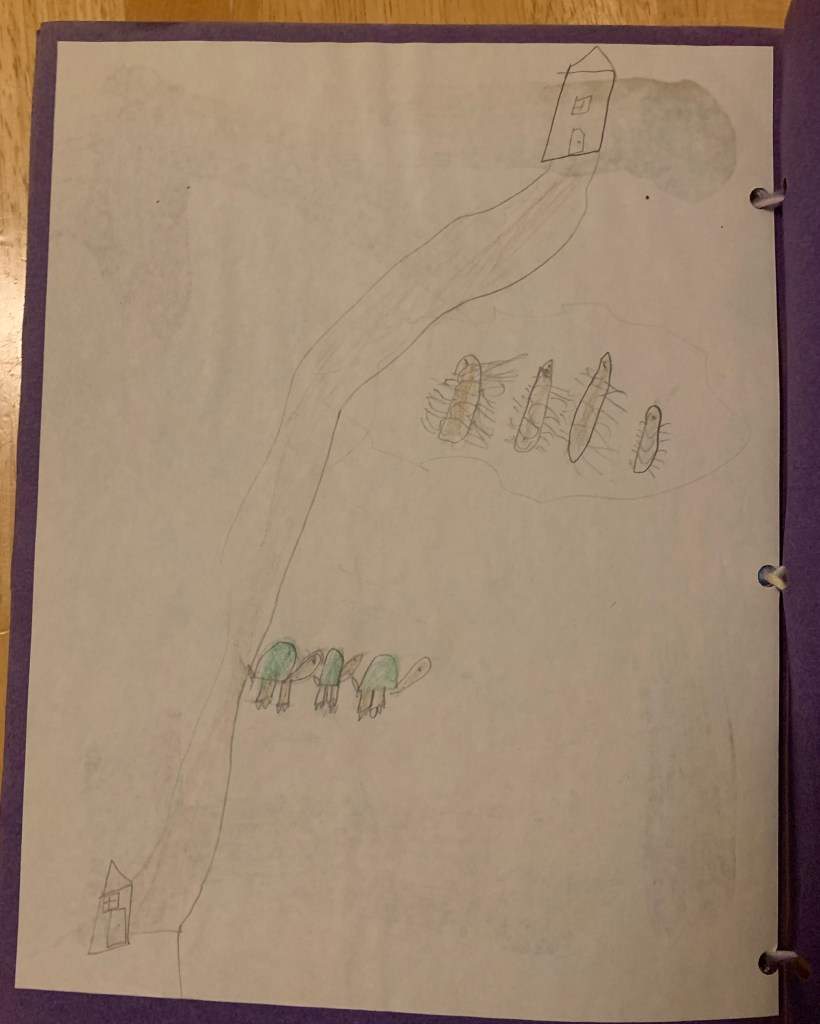 Strangest, while tastefully and admittedly elegantly mimicking the unskilled drawings of a child in perhaps the lower echelons of color-within-the-line skills and raw creativity, even for that age group, the handcrafted book is filled with charming subplots and dramatic use of pre-existent white space that happened to fit the theme. In stark contrast to Centipede, which makes use of exclusively animal characters (friends and family members alike) that displays a characteristicly blurred and humanoid projection of the world, an only misty and hazy-at-best grasp on predator/prey interspecies fraternization; through the work the author wrestles with profound and apt emotional childhood themes of what really constitutes a family unit (three to four centipedes in this case, or three turtles).